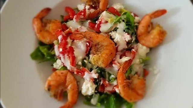 - Schlüsselzutaten: Gebratene Garnelen, Kirschtomaten, Gurkenwürfel, schwarze Oliven, Feta-Käse, rote Zwiebelringe, frische Petersilie.